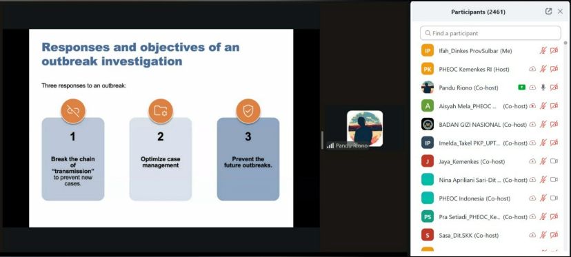 Kegiatan ini dilaksanakan secara daring melalui Zoom Meeting dan melibatkan seluruh petugas surveilans di tingkat nasional, termasuk program terkait seperti Kesehatan Lingkungan dan Promosi Kesehatan.